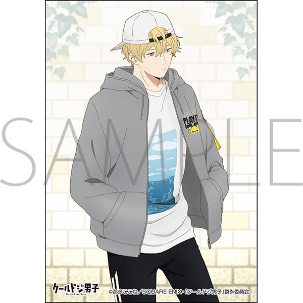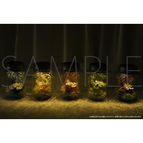ガラス瓶にキャラクターカラーのお花をアレンジしました。新規描き下ろしイラストを使用したブロマイドがセットになっています。